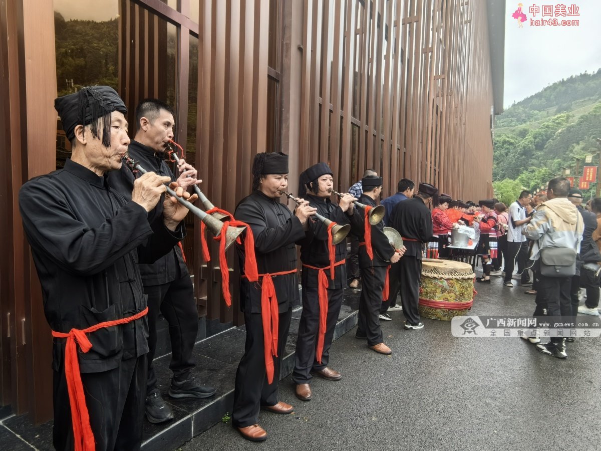 红瑶男同胞们吹响唢呐、敲锣打鼓欢迎游客到来。